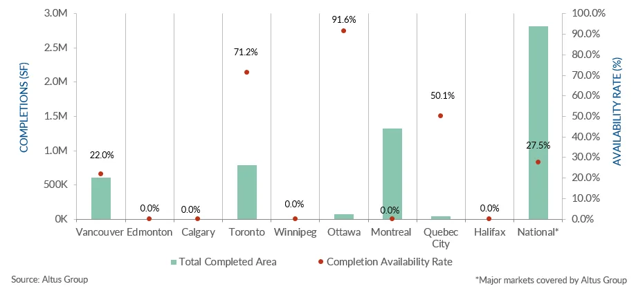- Au quatrième trimestre 2023, 11 immeubles de bureaux avaient été achevés, Toronto étant en tête du pays pour le nombre d'immeubles achevés.
