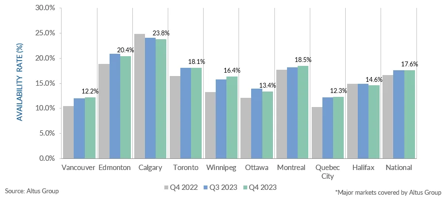 - Au quatrième trimestre de 2023, le taux de disponibilité des bureaux nationaux s'est stabilisé partout au Canada, se maintenant à 17,6 % par rapport au trimestre précédent.
